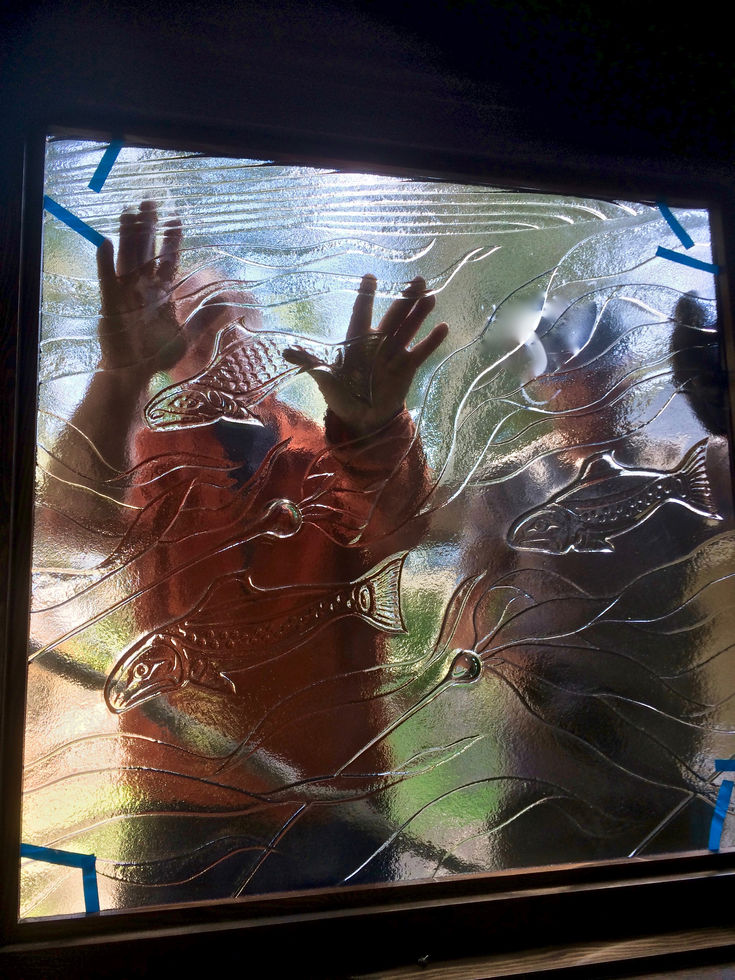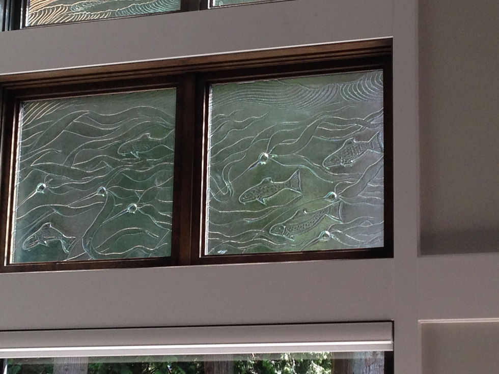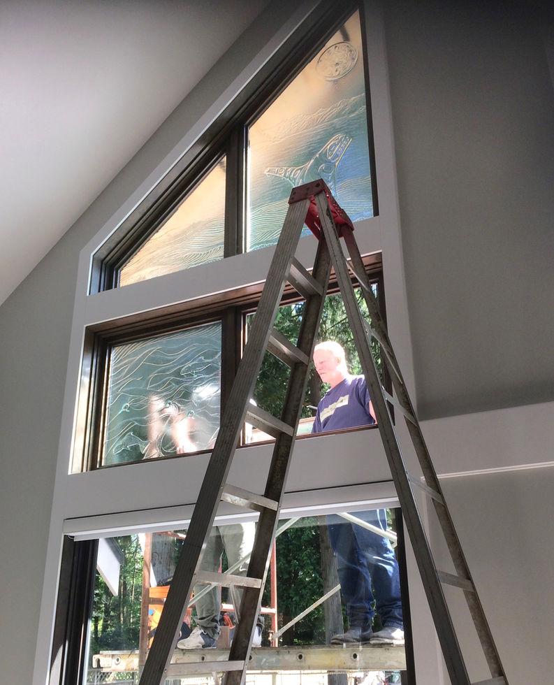 To add an extra dimension to the project, we worked with First Nations artist Jason Hunt. Jason is a Kwagiulth artist from Port Hardy. He created the stunning designs for the male and female salmon, the two orcas, and the moon. We think the work looks stunning installed in the vinyl framed windows which have a dark-stained wood finished interior.