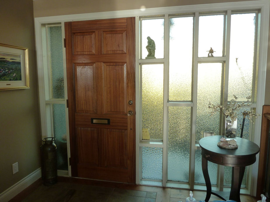 We worked with our finishing carpenter and custom door maker, Dave Ingram to re-create the divided lites and created a custom door to follow the divisions. The design is a weeping cherry tree with sandblasted cherry blossoms.